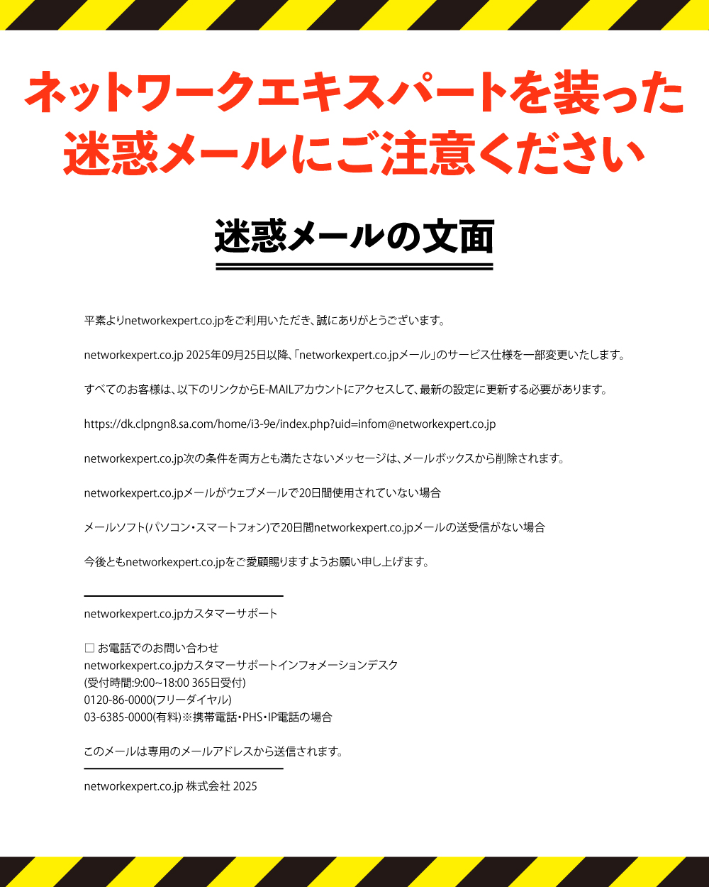 networkexpert.co.jp 2025年09月25日以降、「networkexpert.co.jpメール」のサービス仕様を一部変更いたします。